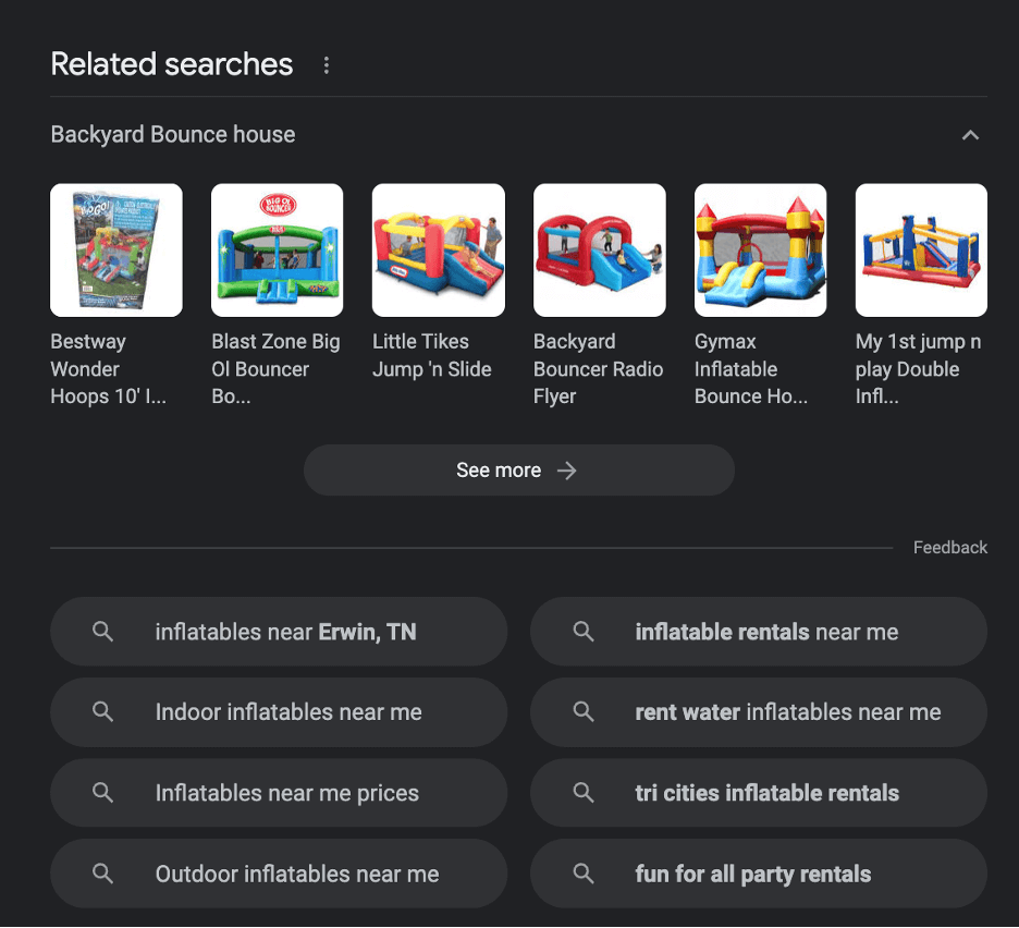 - Keyword Phrases: Groups of two or more words that are used together in search queries, targeting more specific searches than single keywords. The content on your page does not need to perfectly match a keyword phrase to rank highly for it; you simply must use close key phrases that Google will understand as relevant (example: “Inflatable Bouncer Safety” ranks high for the query “Bounce house safety rules”).