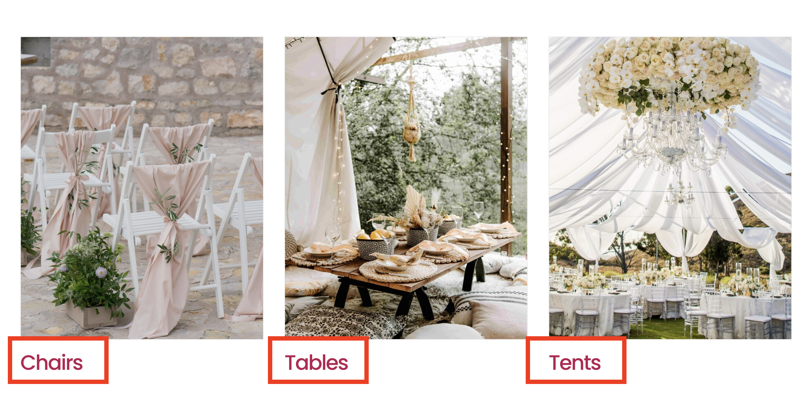 If they choose “Tents,” show the different types of tents you offer, such as canopy tents, pole tents, or marquee tents. If you provide enough information about each option, including sizes, materials, suitable events, and any additional accessories available for rent, your customers can quickly make an educated decision on which rental they need for their event.